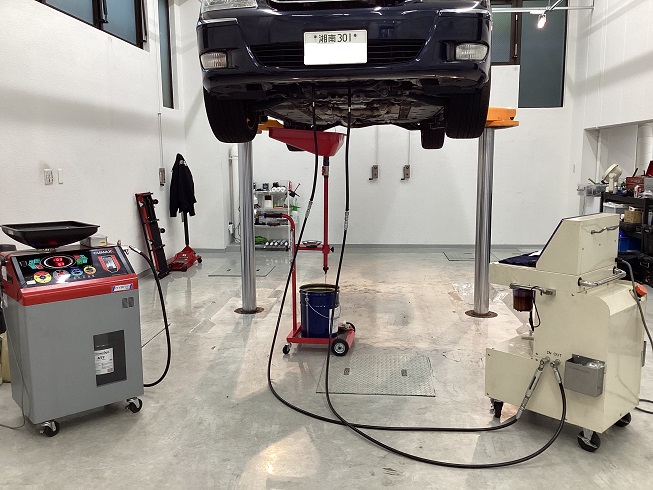 続いてAT側は還流洗浄後、ATFチェンジャーにて新油に入れ替えていきます。
